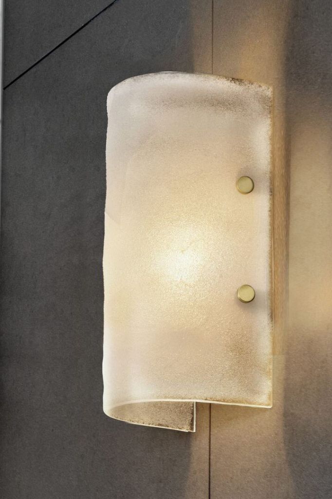 The sculptural, curved glass is skilfully textured by artisans to achieve a cloudy, translucent finish. Complemented by the subtle brass detailing.