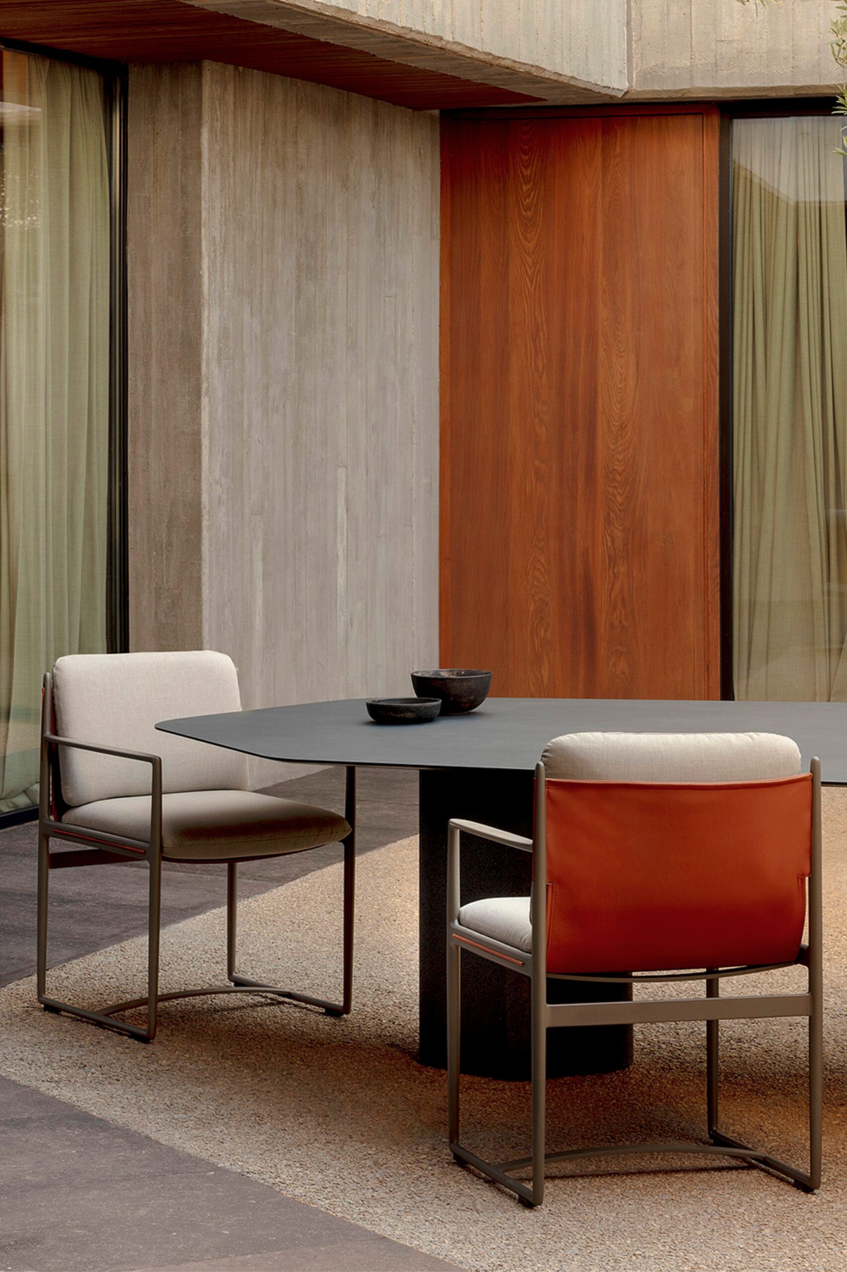 Nido is an outdoor collections. Essential because its modularity, its upholstery, the richness of its textures and its resistant structure made of stainless steel tube, the best of guarantees when producing for outdoor use.Obi dining armchair