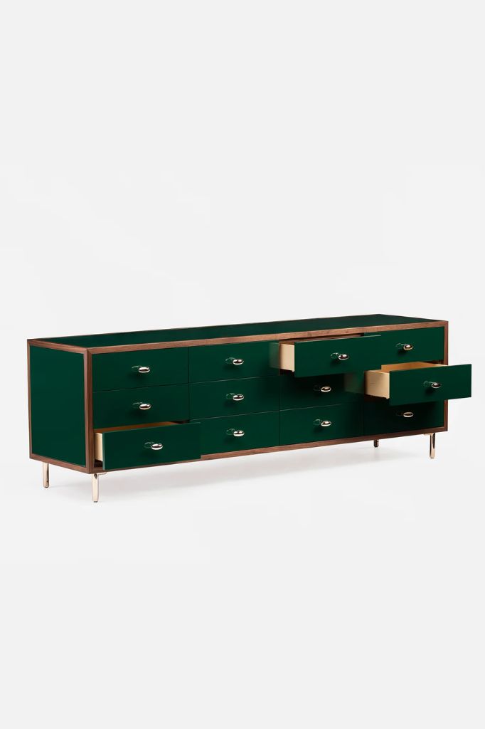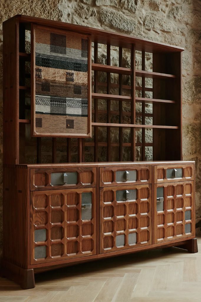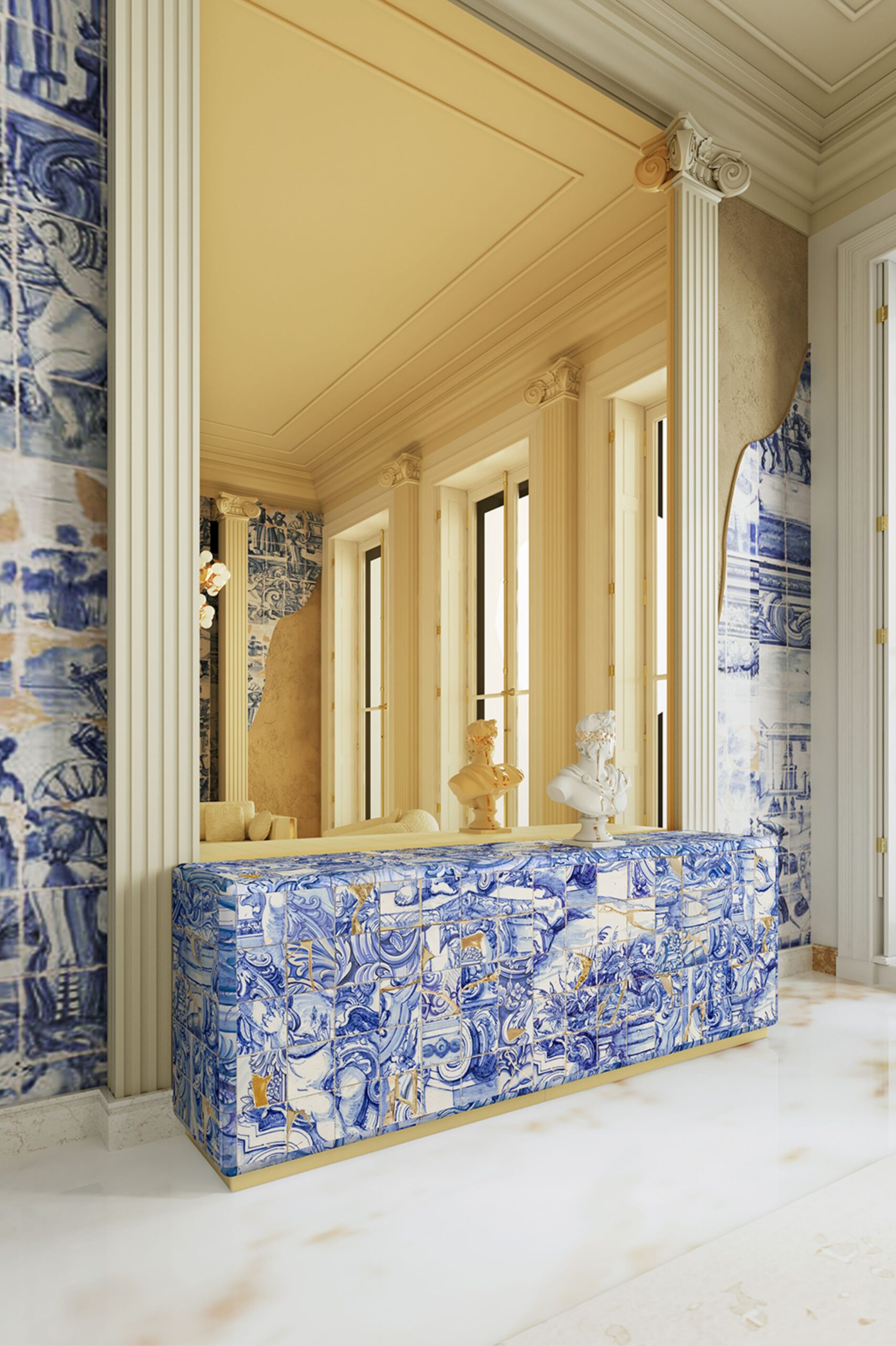 Pokryty ręcznie malowanymi kafelkami, kredens wykorzystuje również japońską technikę kintsugi, w której niedoskonałości i pęknięcia płytek są podkreślone złotymi akcentami, tworząc unikalny produkt, który celebruje piękno w znakach czasu.
