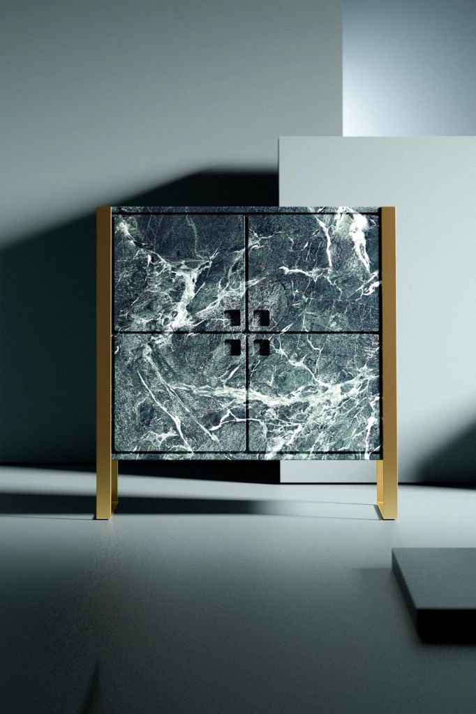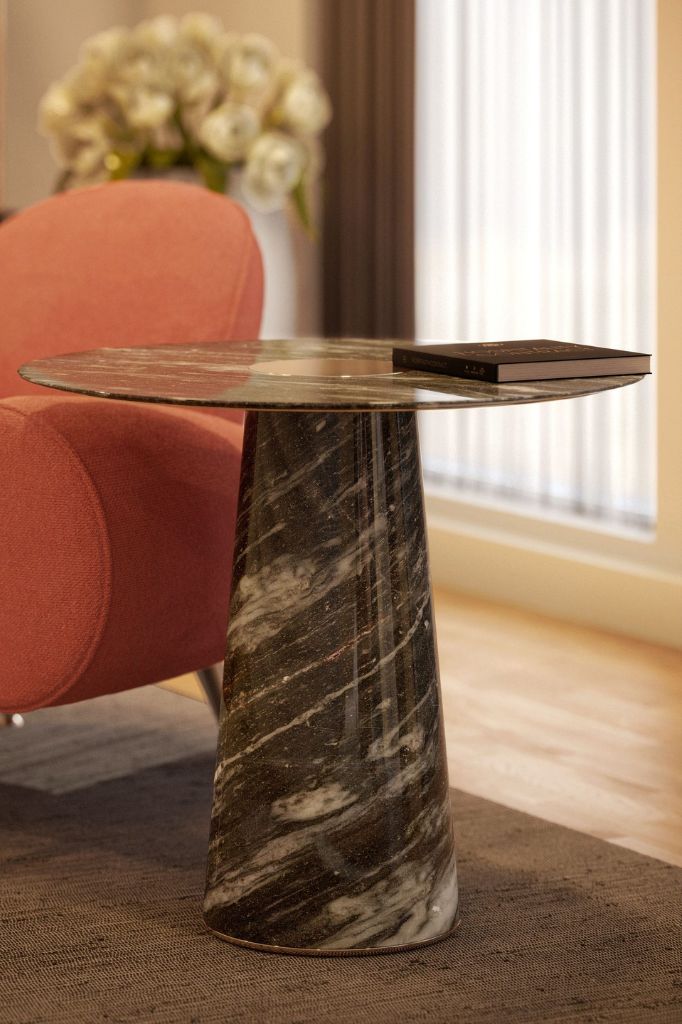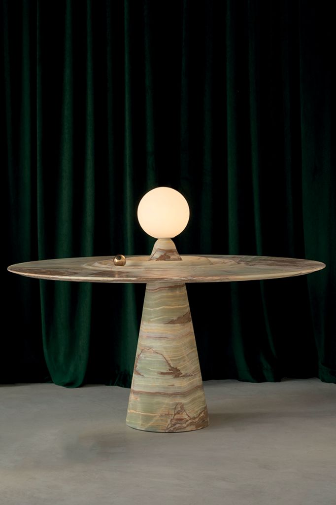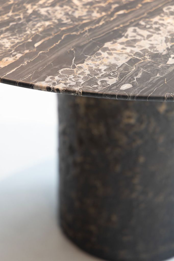 Proces, geometria, ciężar i odporność pozwalają stożkowej podstawie z brązu SK207 wspierać duże blaty z marmuru, tworząc wyjątkową kombinację materiałów, powierzchni i tekstur.