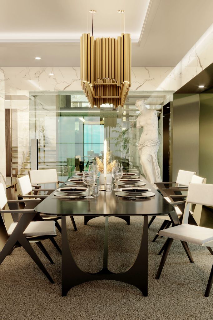 Stół do jadalni Bronze to piękne połączenie marmuru i mosiądzu. Zaprojektowany przez Alessandro Serafini.budino