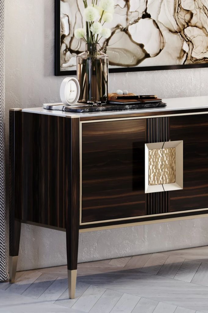 Kredens z ciemnego drewna z marmurowym blatem i szczotkowanymi mosiężnymi detalami.