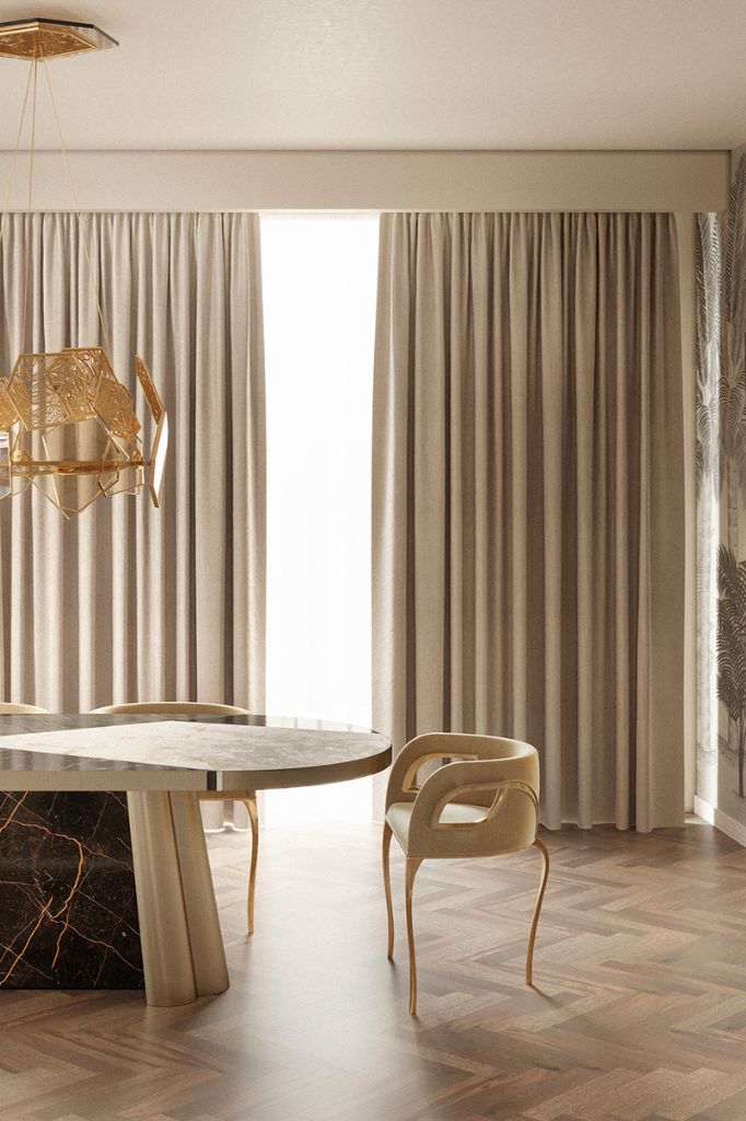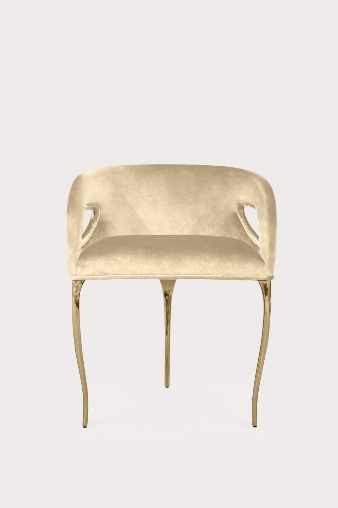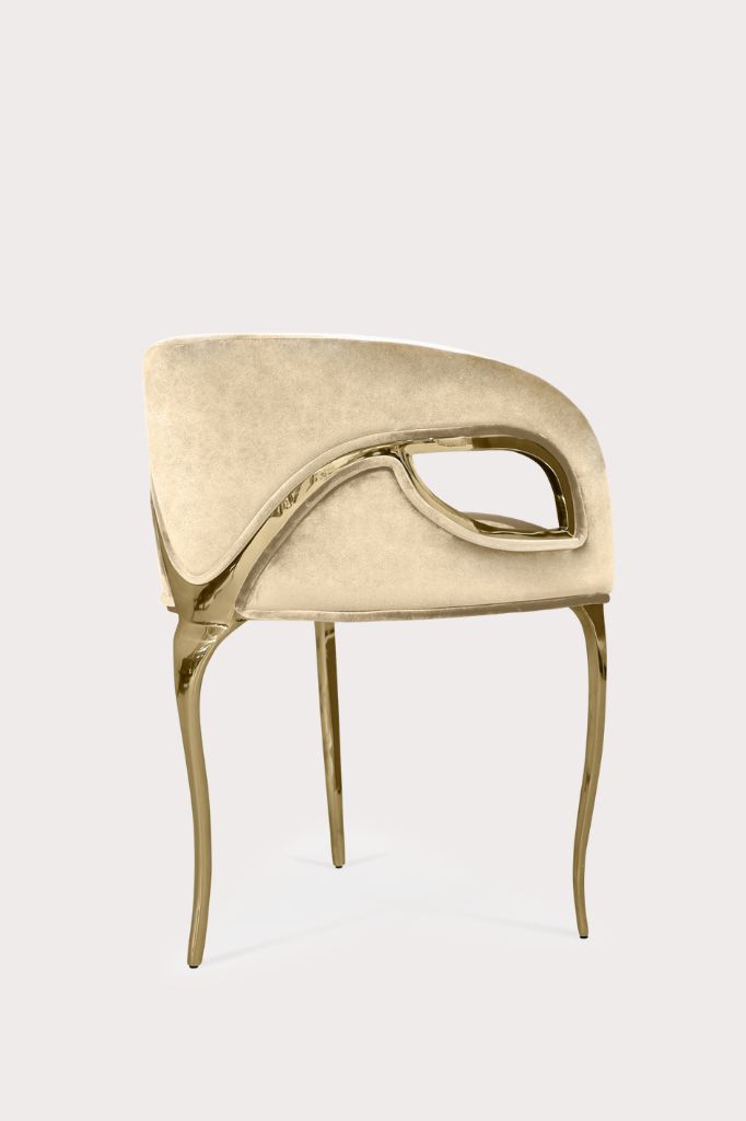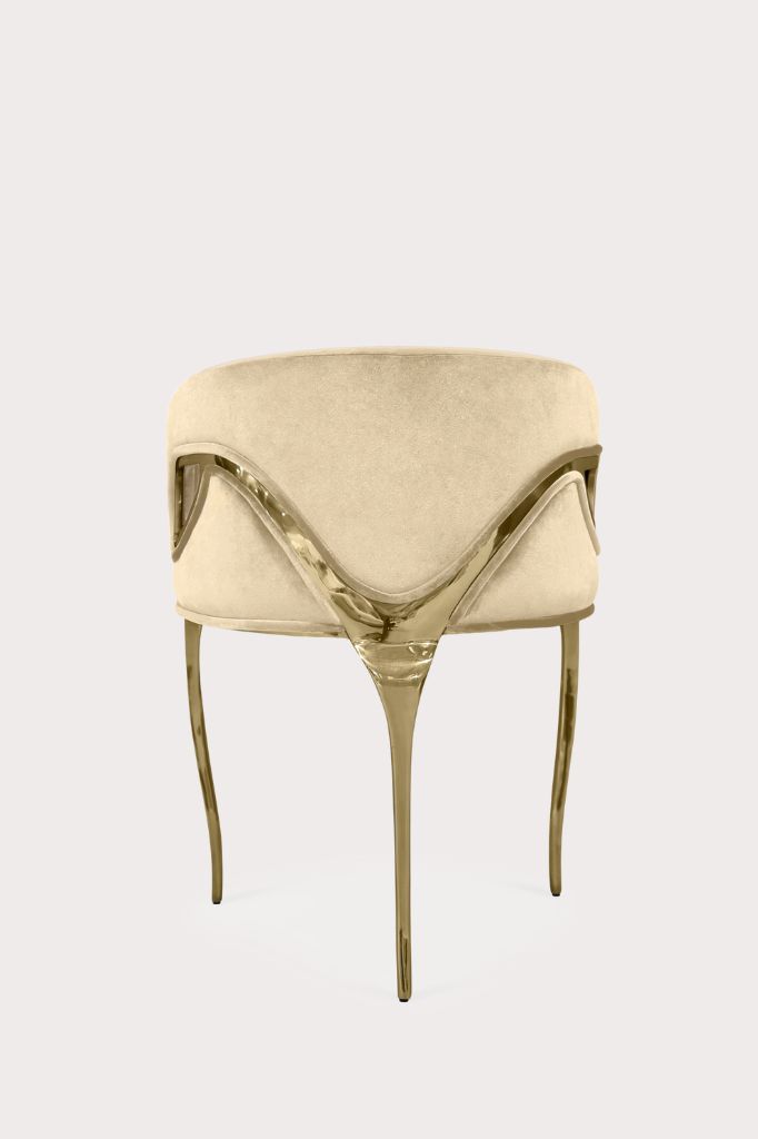 Nowoczesny charakter krzesła Chandra emanuje elegancją w stylu vintage, a metalowe paski delikatnie łączą elementy konstrukcji, podkreślając płynność linii oparcia.