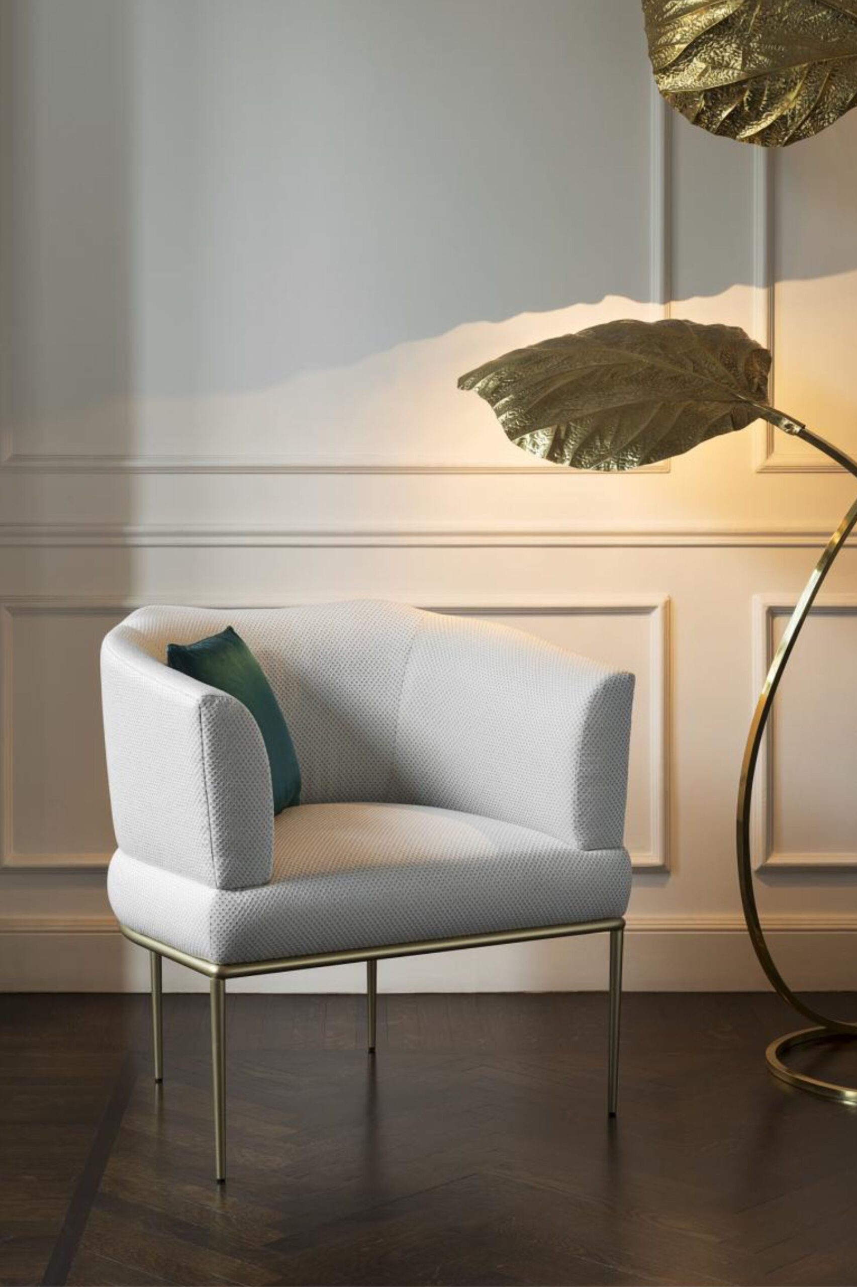 Clintón to kultowy fotel z kolekcji Rubelli Casa. Oparty na smukłej metalowej podstawie, dostępny jest w różnych wykończeniach satyny i połysku. Doskonale komponuje się z sofą Palazzo.