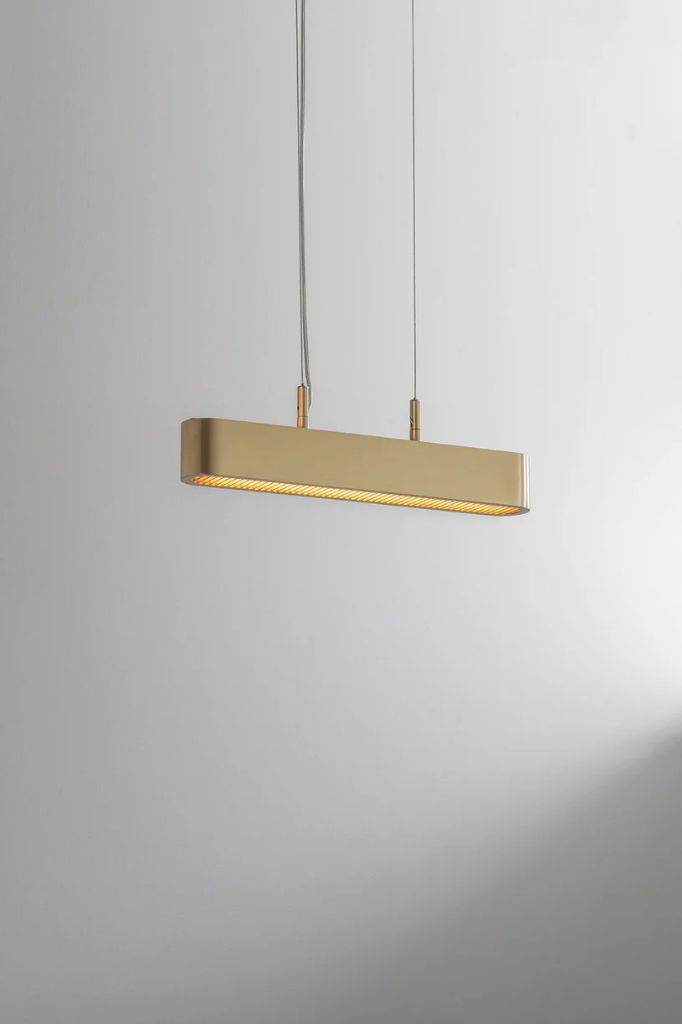 Obrabiany maszynowo ciężki mosiądz i smukły, szczelinowy dyfuzor rzuca miękkie światło na sufit i podłogę.