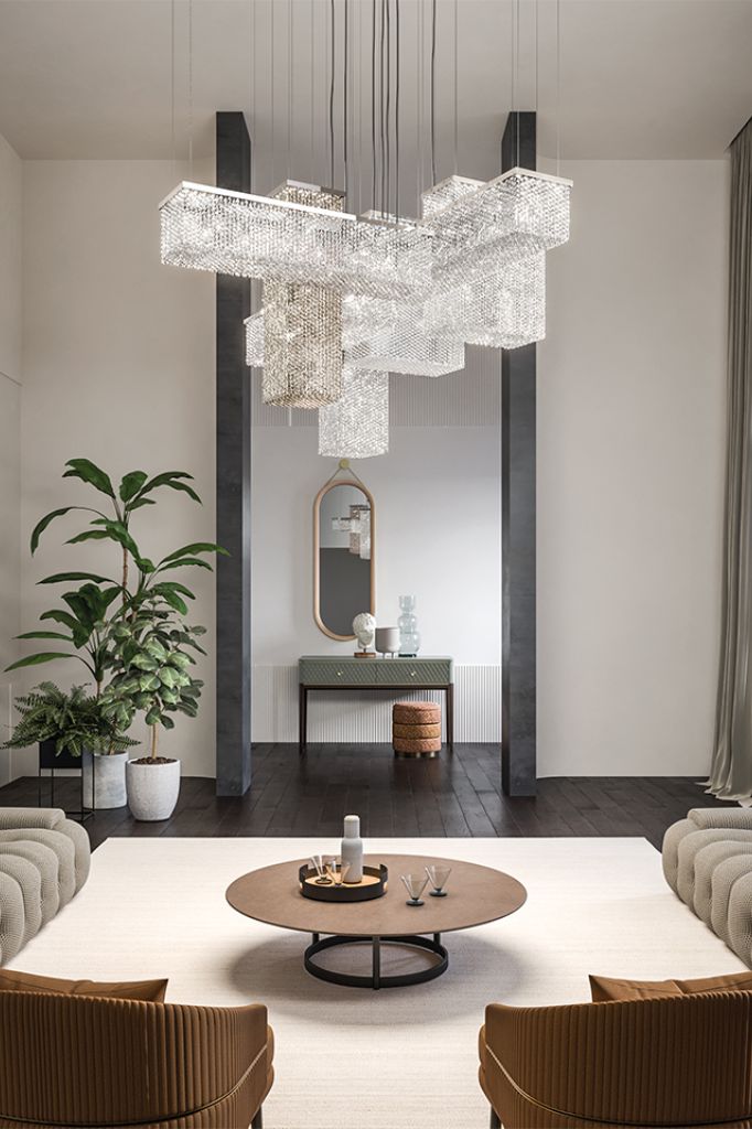 By combining hypnotic sparkle with geometric rigor Cubo, a modular system of suspended parallelepipeds, gives life to precious architectures featuring well-defined contours.