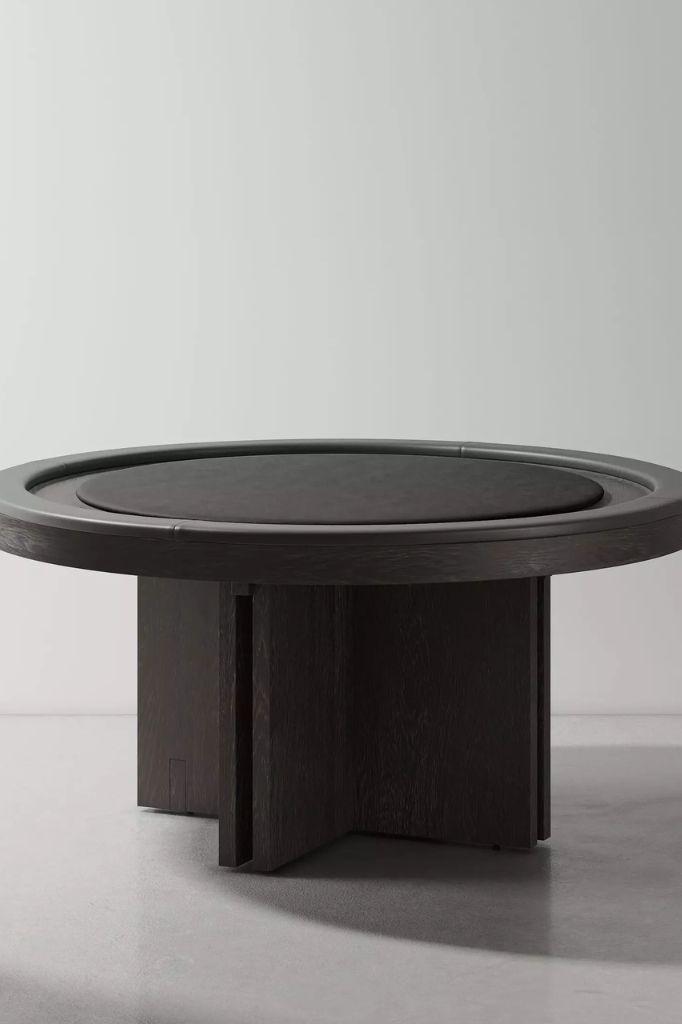 Dinh Poker Table’s well-rounded charm is derived from a balance between volume, texture and style. Its singular structure is crafted from solid oak, and composed of the modernist-architectural motif that inspires this collection. The tabletop’s edges are overlaid with high-quality leather, while its playing surface is covered with felt fabric. These hands-on detailing adheres to a harmoniously restrained palette, and enriches the table’s quiet sophistication.