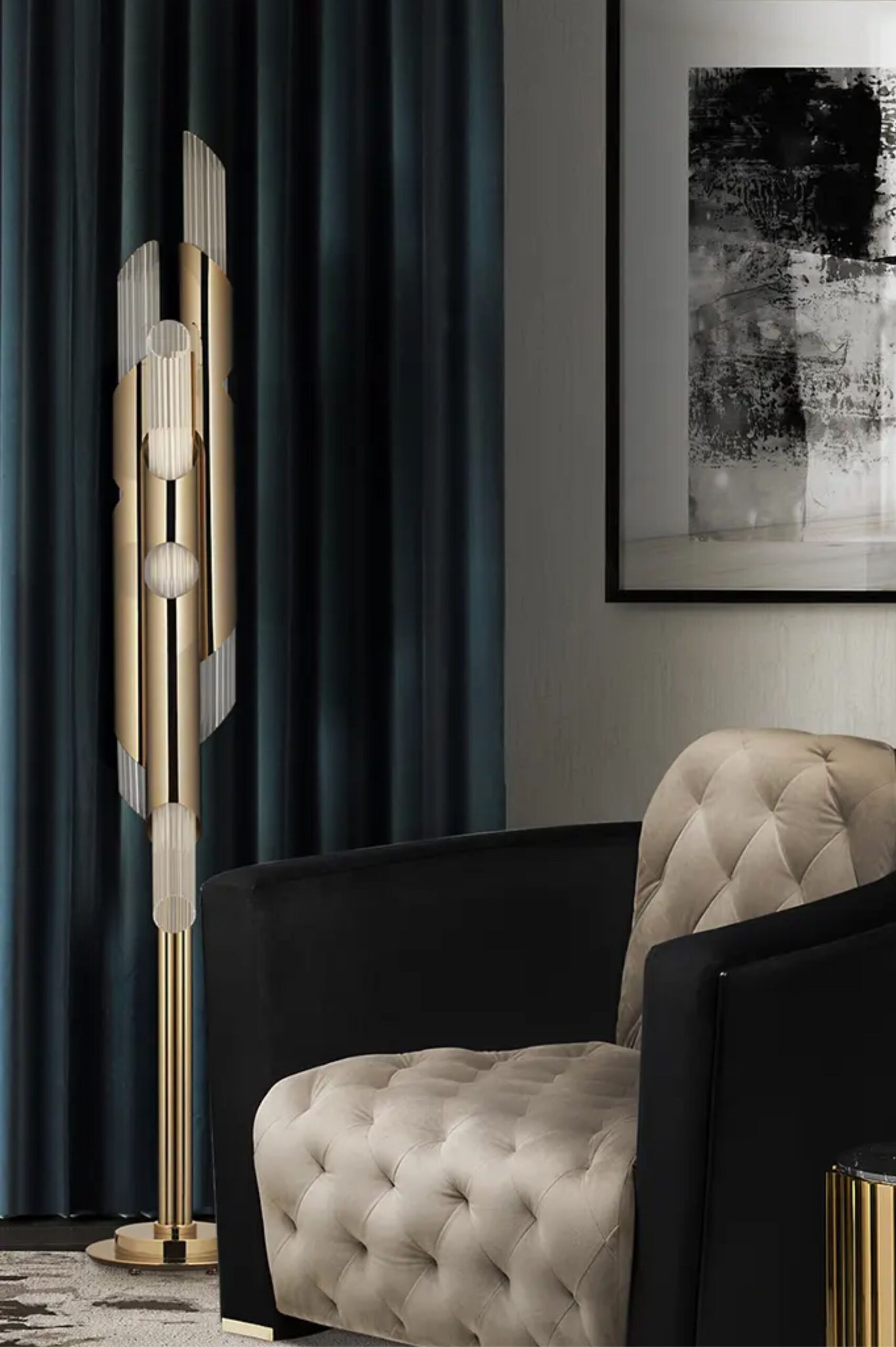 Draycott takes a different posture to create an elegant standing lamp with gold-plated brass and delicate crystal tubes like the original inspiration.
