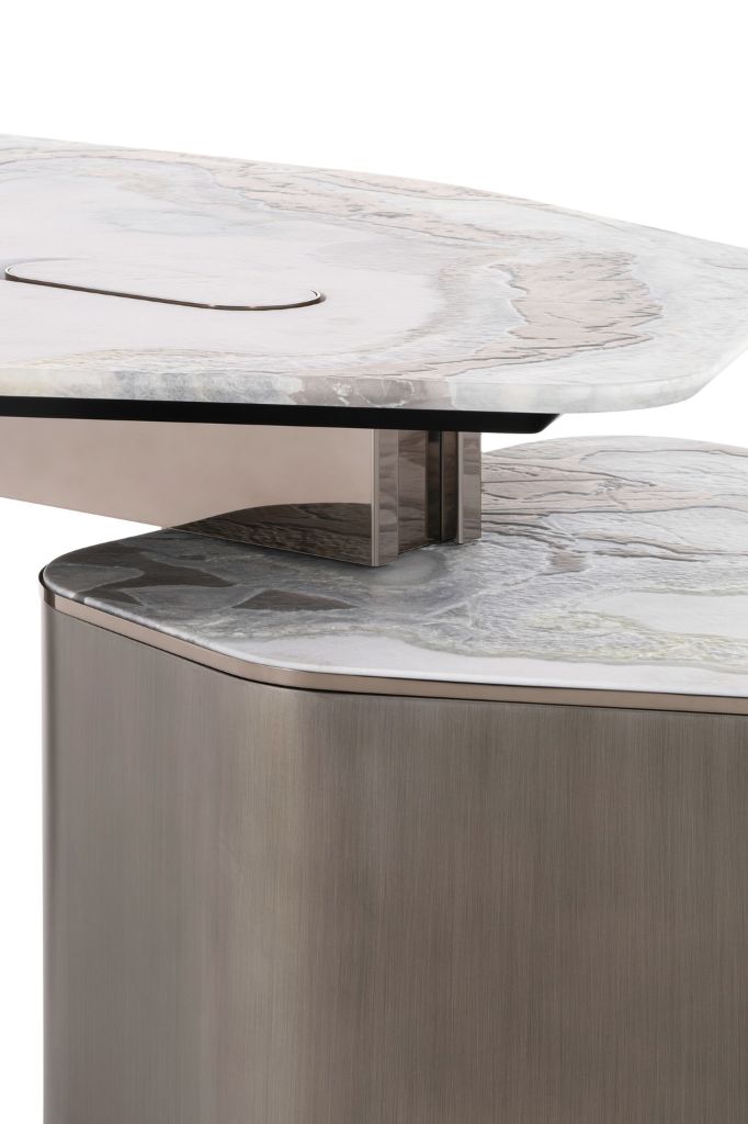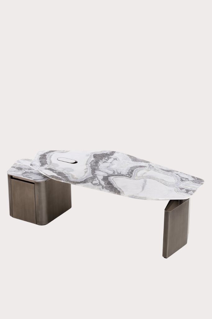 Desk with a metal structure and double-level marble top, defined by an asymmetrical geometry and a leather-finished surface. A monolithic central beam supports one leg and a drawer unit, both clad in satin-finished steel or leather.
