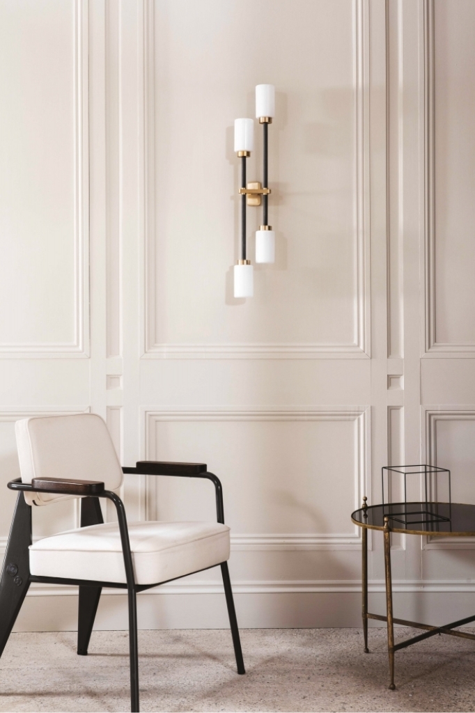Two slender arms set four cylindrical glass shades at asymmetric heights. Finished in brass and bronze and available with opal or smoked glass shades and in left or right hand orientations.