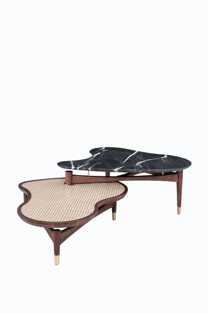 Franco center table combines sleek Scandinavian design with a fun mid-century modern look. Crafted from solid wood with oak leaf finish and metallic details, it features two rotating tops – one top in marble stone and one in straw with clear glass. A stunning centerpiece for any interior project, adding sophistication and charm to your home decor.