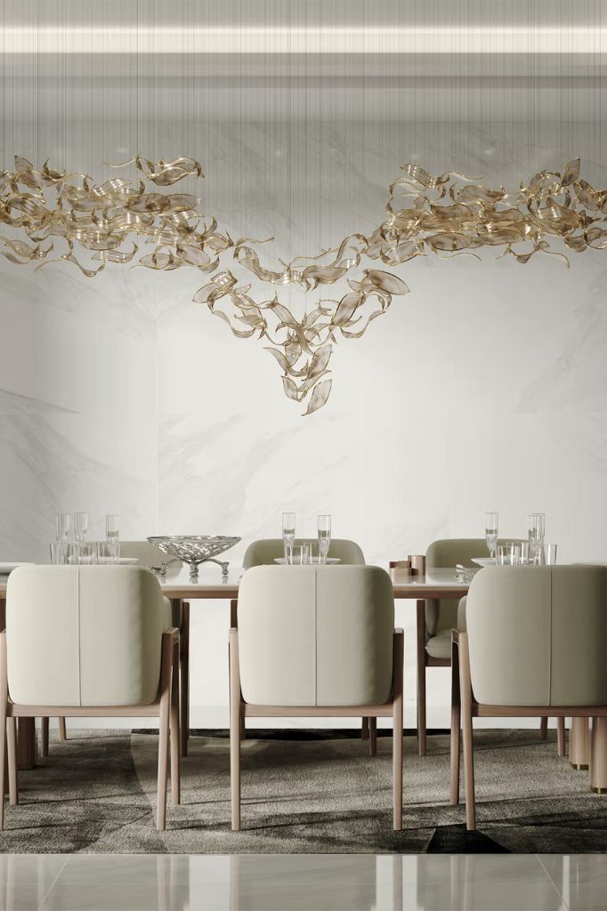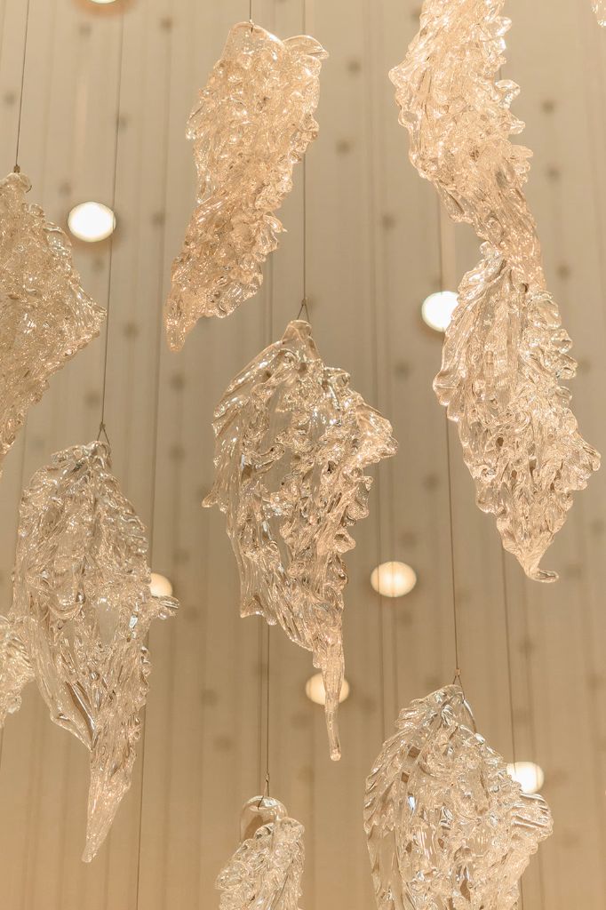 The design is taken from Sans Souci’s FROSTY LEAVES collection and features individual hand-blown glass components in crystal colour with mica and a stainless-steel finish. Each component is suspended in a specially designed formation to create a dramatic swirl through the atrium, drawing your gaze upwards.
