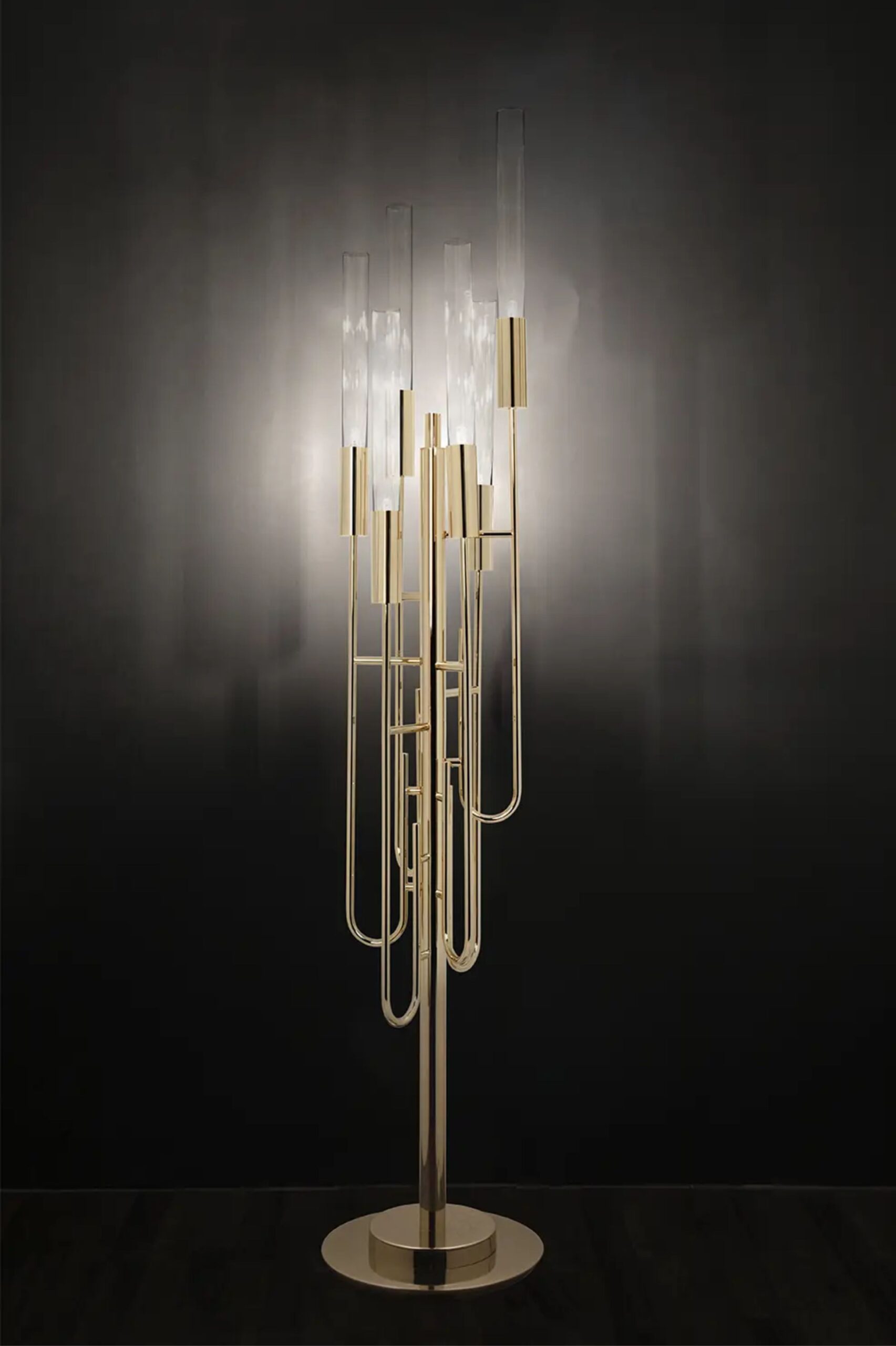 Discover the unique Gala Floor Lamp, elegantly made of gold-plated brass and crystal glass. This modern floor lighting solution combines classical design with a modern approach.