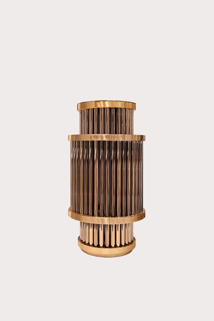 Glass table lamp on two superimposed levels. Satin-finished steel frame and central body composed of a drum of pyrex glass rods available in the following finishes: clear, satin-finished (FROST) or PVD gold finish (AMBRA).