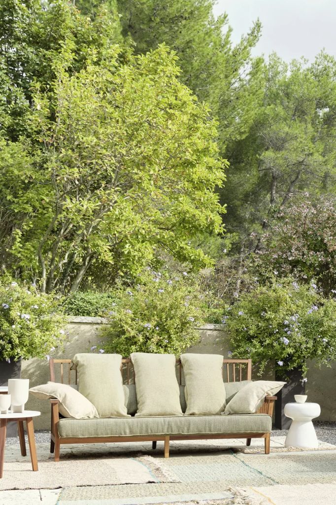 A comfortable and cozy sofa made of oiled iroko wood, which is exceptionally durable as it is naturally resistant to water and moisture. The contrast between the solidity of the wide slats and the softness of the removable cushions made of waterproof polyurethane foam makes this piece of furniture both sophisticated and functional.