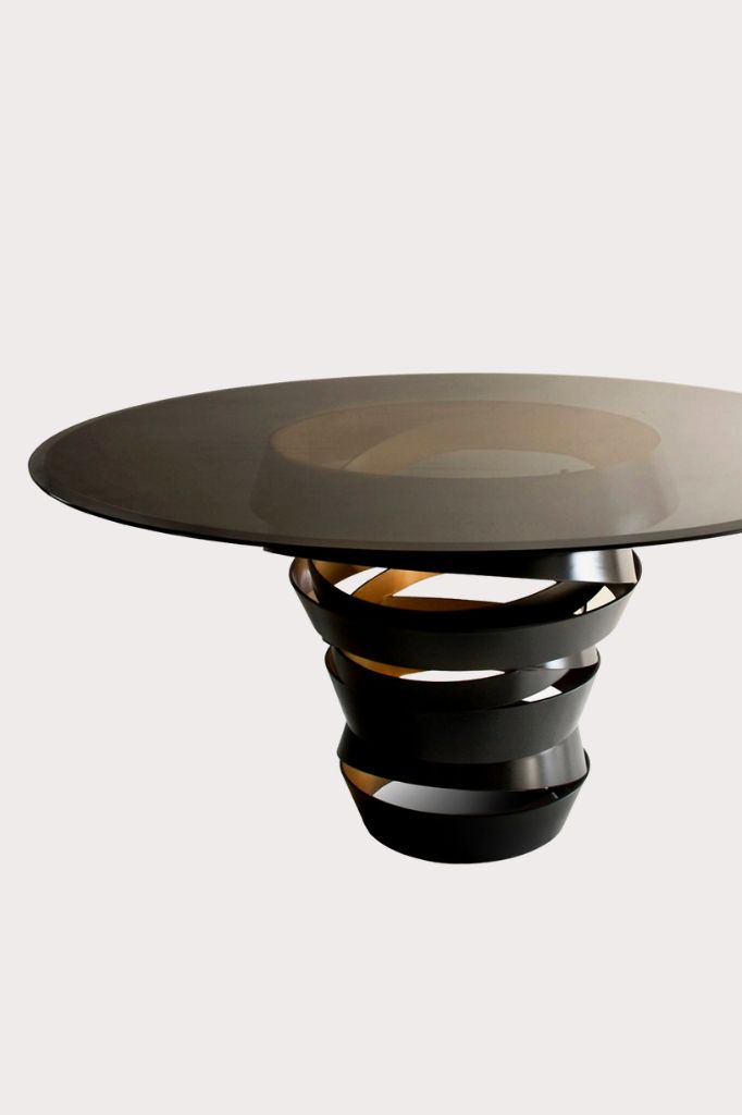 The swirling metal ribbon of the Intuition dining table evokes the mysterious and divine feminine instinct. Carefree and unexpected swirls are guided by emotions and desires. The two-tone metal base is topped with a perfect glass circle top.