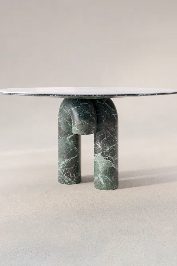 A celebration of marble’s beauty and diversity. this version is features a captivating combination of Bianco Crystal and Verde Alpi marbles, this table showcases a striking contrast of colors and textures, exuding a refined and sophisticated aesthetic. Its slender round top and gentle conical base offer a unique shape, while its legs take on the form of inverted 'J’s, adding a playful touch to the overall composition. Crafted entirely of Verde Alpi marble, these legs demonstrate the enduring beauty and strength of natural stone. The Juni table is more than just a functional piece – it is a sculptural shape that can be customized with different stone options. This artistic table expresses the elegance and purity of marble in a fresh and original way.