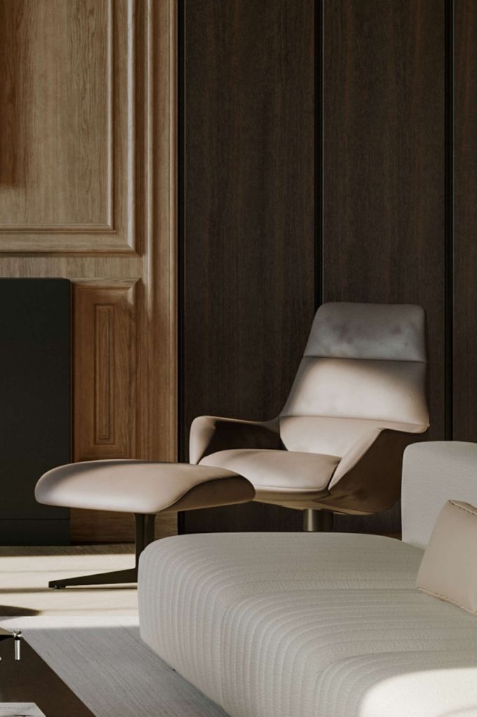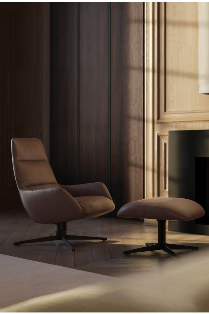 Designed by Christophe Pillet, the sophisticated Lady Jane bergère features bold lines which bely its 1950s inspiration. This versatile, elegant and comfortable piece is equipped with a mechanism that allows the chair to rotate 360° and works perfectly in domestic spaces. The bergère has a matching padded pouffe footrest with a bronze metal structure, to ensure maximum relaxation.