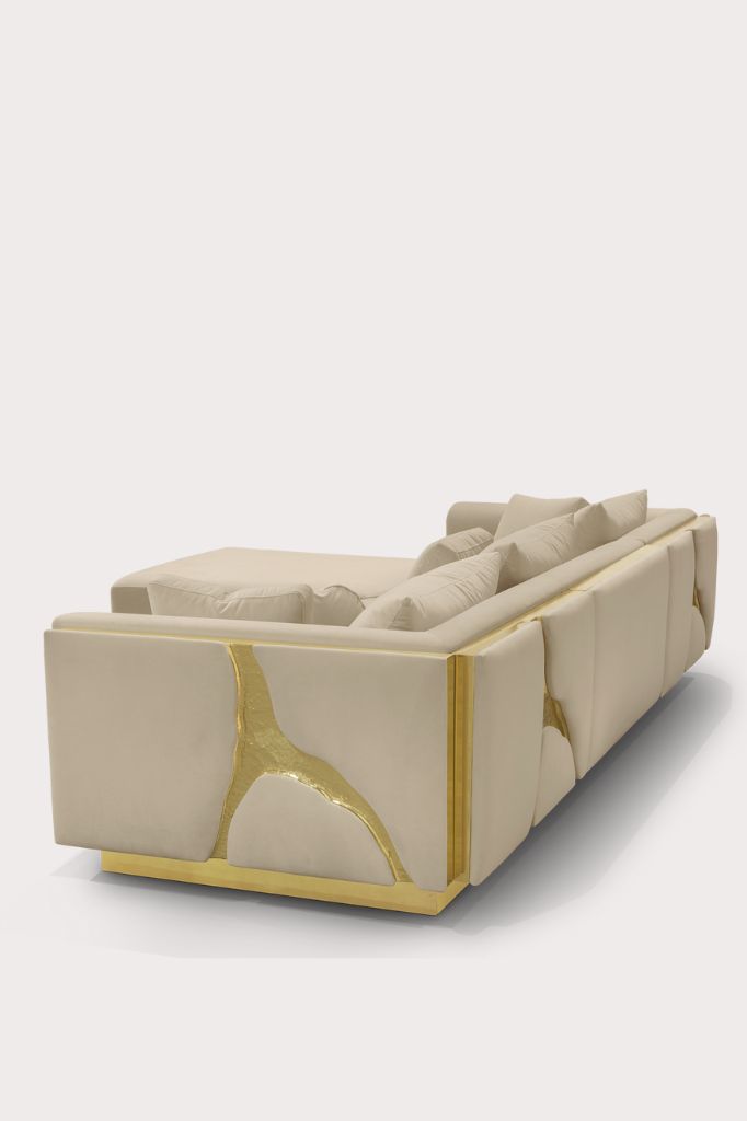 Organiczne formy zostały uzyskane poprzez ręczne dopasowanie polerowanej blachy mosiężnej, a zdecydowany charakter dzięki polerowanej stali nierdzewnej tworzącej idealne lustro.LAPIAZ MODULAR SOFA