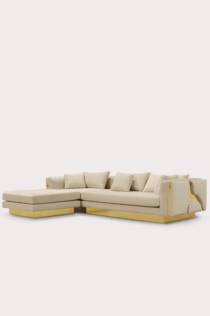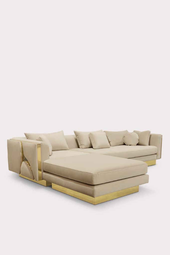 Ta wyjątkowa sofa modułowa przenosi kunszt i design na nowy poziom. Nowoczesny mebel inspirowany jest autentycznymi formacjami górskimi. Odnajdując piękno w najbardziej nieoczekiwanych miejscach, sofa modułowa charakteryzuje się wysoką jakością wykonania i kreatywnymi rozwiązaniami, które zostały osiągnięte dzięki ręcznemu dopasowaniu elementów oraz połączeniu polerowanego mosiądzu z tkaniną.