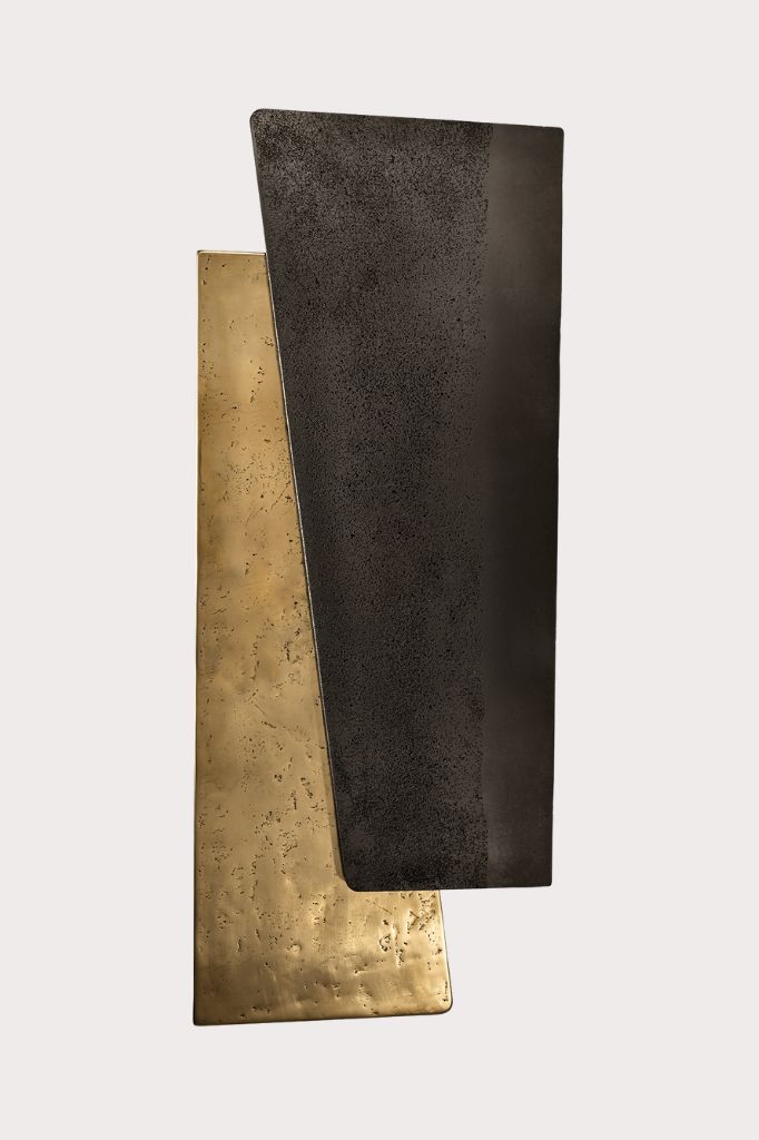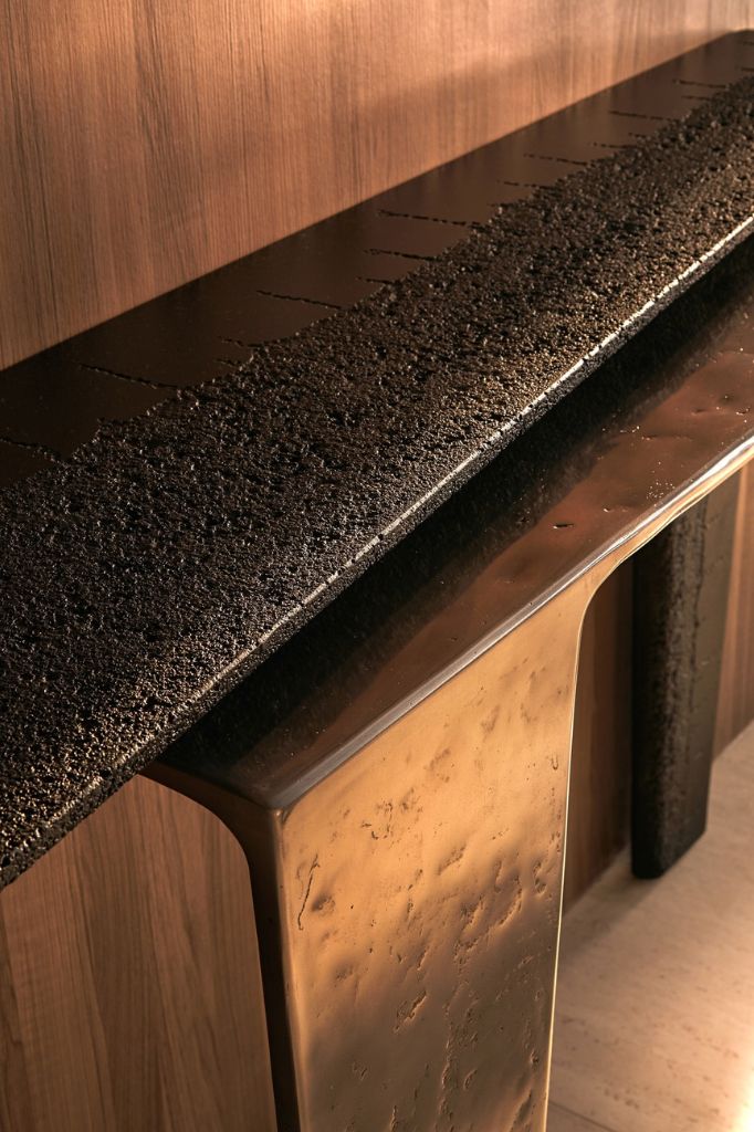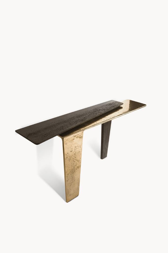 Sculptural console, made of two interlocking volumes allowing three configurations. Load-bearing structure in reinforced concrete and aluminum. Concrete is treated with erosion and matte black color; aluminum is hand-polished, pigmented, and sand-cast with an undulating texture. Wall attachment required. Also available in „Marble” version.