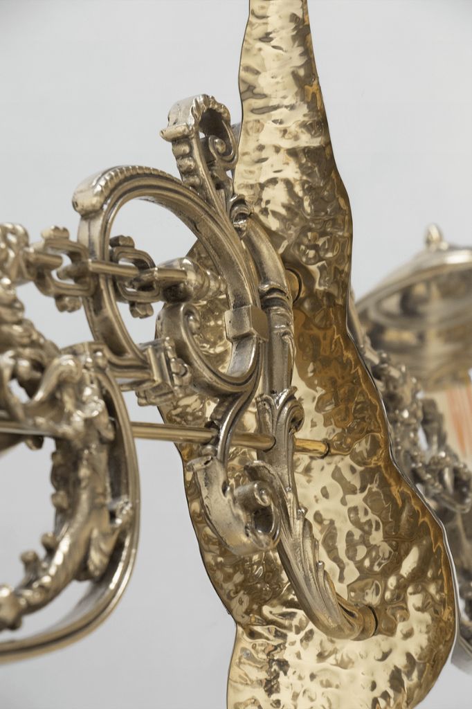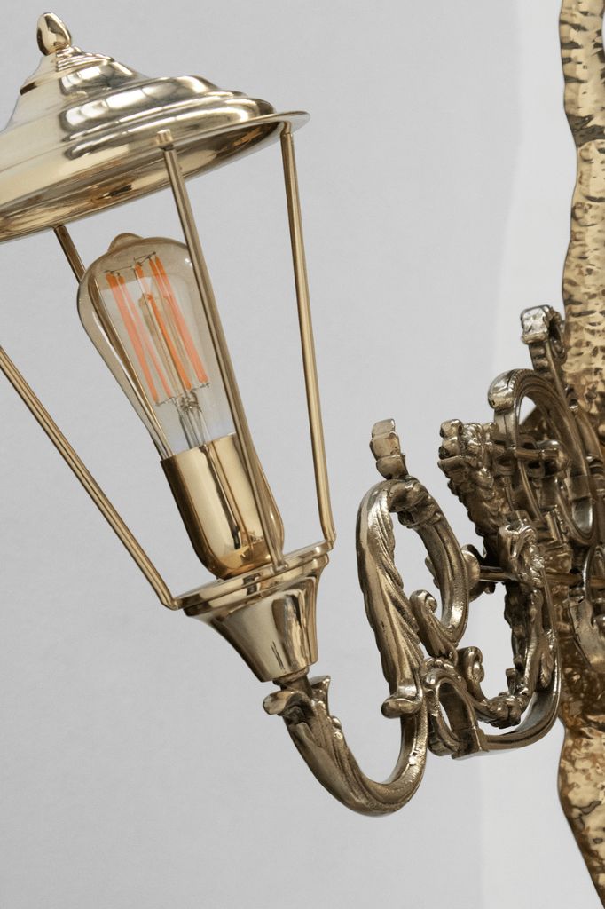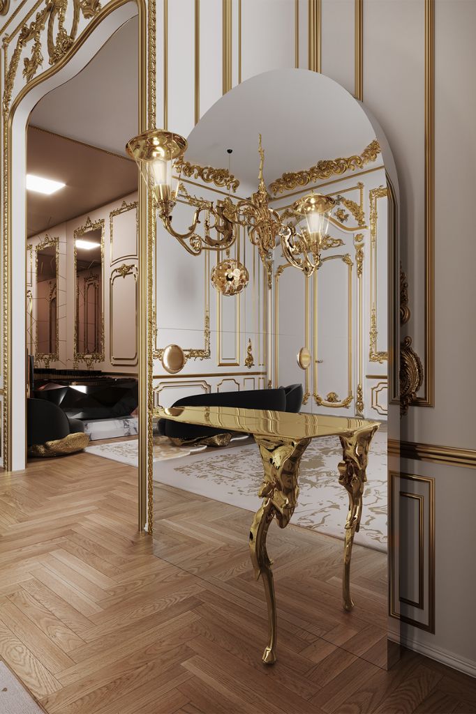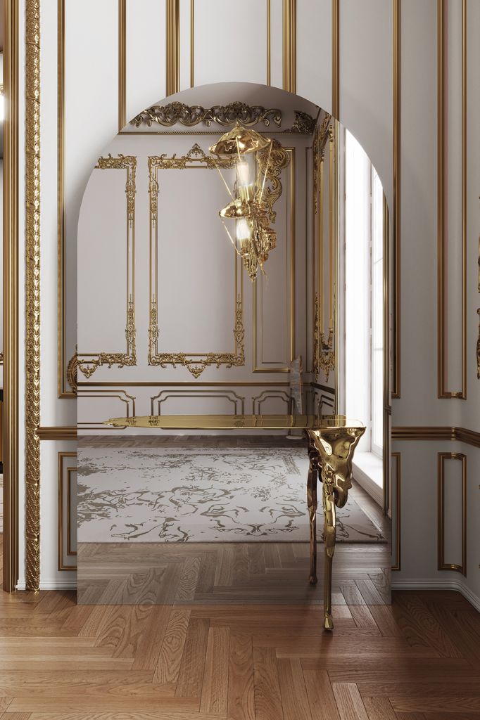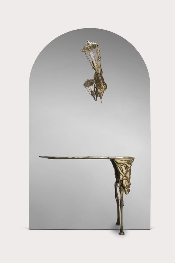 The mystic of the late XIX century boulevards is brought to your home by the masterpiece that is Lumière Console. A synergy of Victorian street lights and architectural lines, the Lumiere exemplifies the contemporary dualities of art and functionality. A sculptural set composed by a large wall mirror, golden lamp and a functional console lies in one arched frame made of wood folded by polished stainless steel.