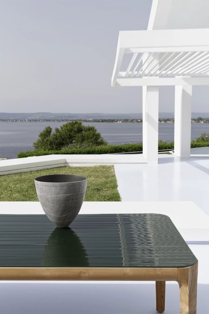 The table from the Mediterraneo collection. Made of natural teak. Combines elegance and versatility. The top is available in white Carrara marble, Pearl concrete, Lava Stone gres, or textured back-painted green glass.