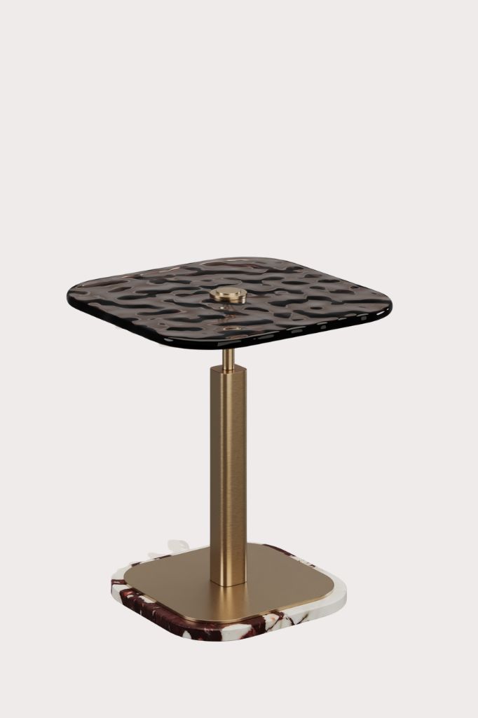 Side table with Calacatta Viola marble base, brushed brass structure, and handcrafted glass top.