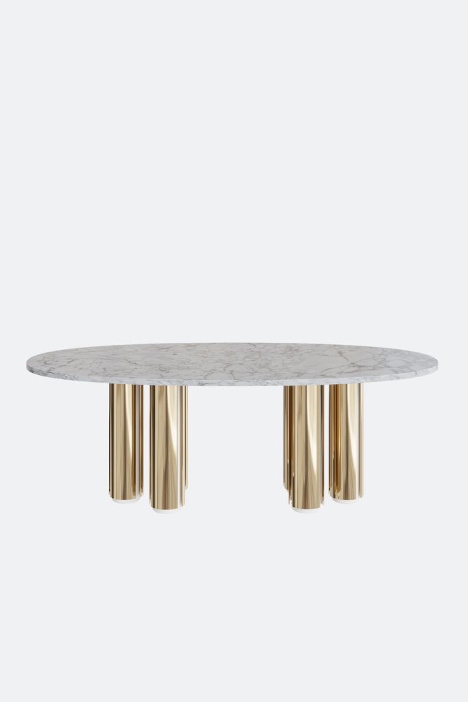 A dining table where light meets stone and metal. The marble top reveals its unique texture, capturing every nuance of natural light. Legs with subtle metallic details reflect a delicate glow that shifts throughout the day.świat bronson: