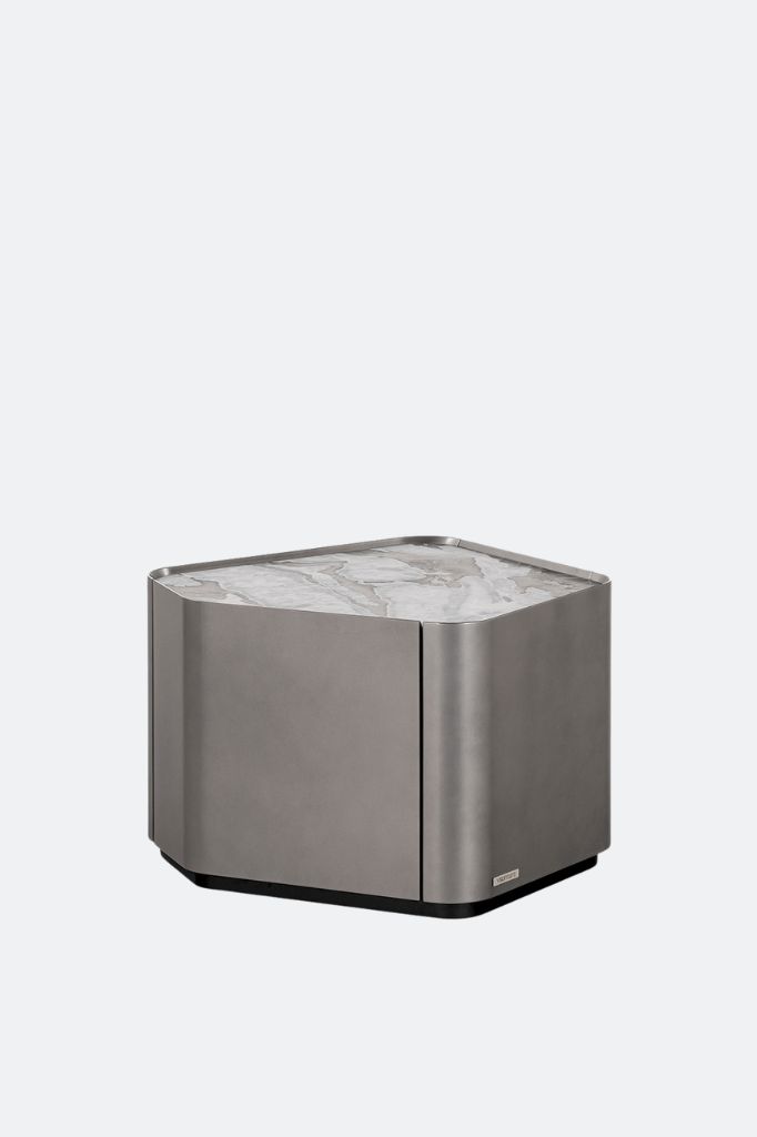 Asymmetric bedside table in varying dimensions, with a shaped wooden structure defined by angled, intersecting walls and a seamlessly integrated door. The high-gloss lacquered finish, available in RAL/NCS or metallic tones, complements the “leather”-finish marble top, adding a tactile and material accent to the sculptural design.