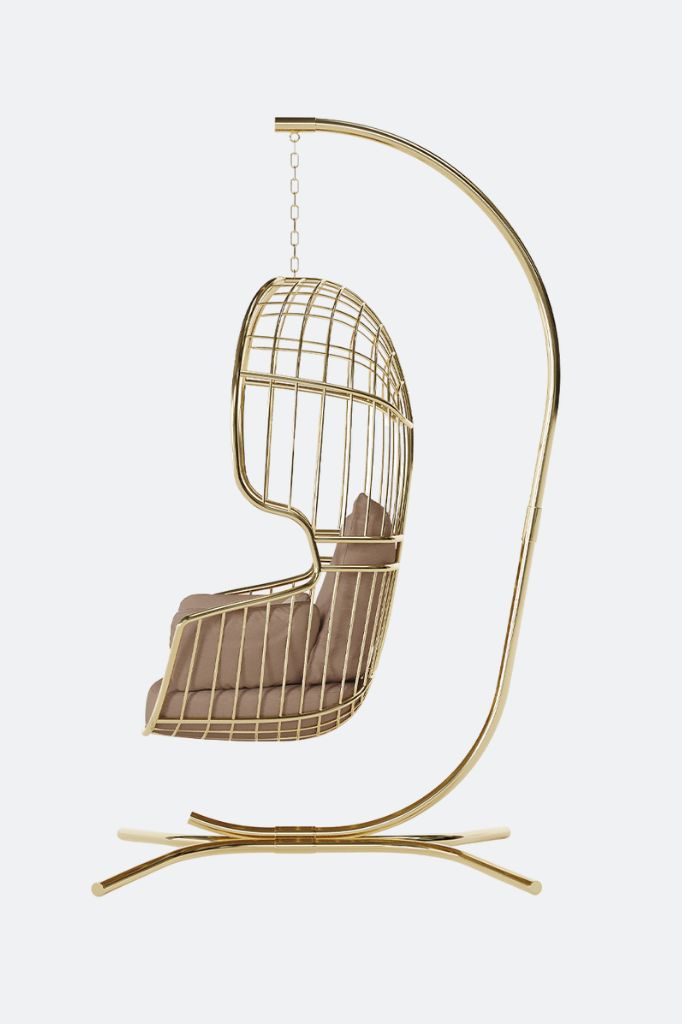 The Nodo Hanging Chair with Base combines durability with elegance, crafted from a coated stainless steel frame for optimal strength and outdoor resistance. Its golden accents bring an air of subtle sophistication, infusing contemporary outdoor settings with a refined, enigmatic elegance that captivates and inspires.