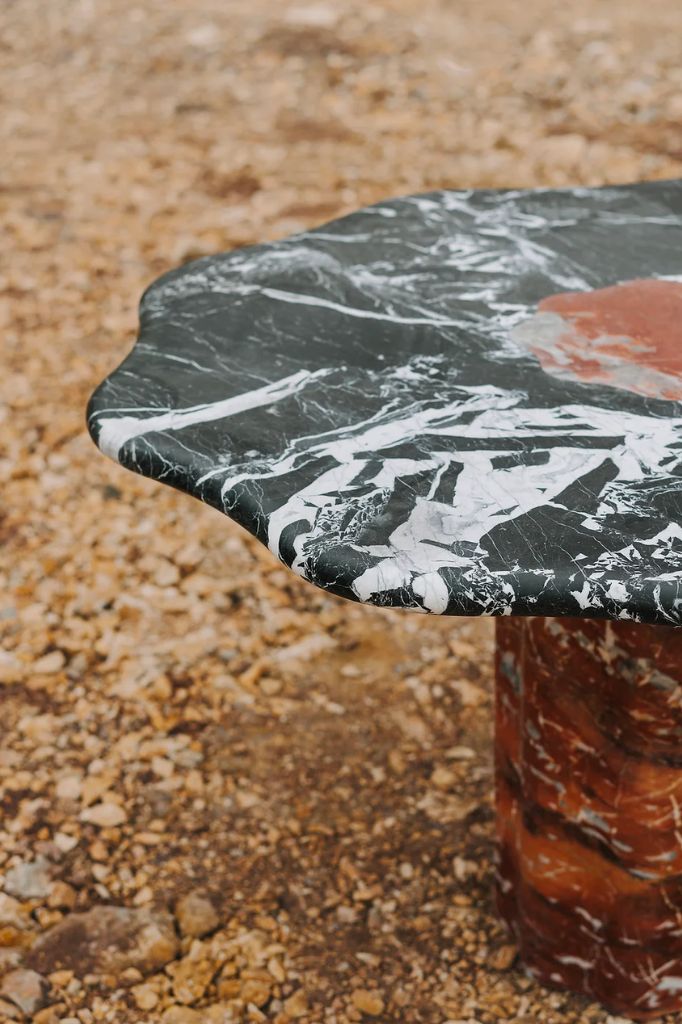 Stół Onda to rzeźbiarskie arcydzieło stworzone z kontrastujących ze sobą kawałków marmuru. Kolory Nero Antico i Rosso Francia zostały wybrane ze względu na ich głębię tonalną i wirujące, malarskie wzory.