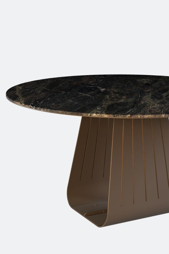 Stół do jadalni, w którego konstrukcja to spotkanie światła z kamieniem i metalem. Marmurowy blat zachwyca  swoją wyjątkową fakturę ekoponując każdy niuans naturalnego światła. Okrągły kształt sprzyja intymności, a nogi z subtelnymi metalowymi detalami odbijają delikatny blask, który zmienia się w ciągu dnia. Obfite proporcje i szlachetne materiały zachęcają do spędzania czasu w komfortowych warunkach. Orizon przekształca jadalnię w przestrzeń pełną elegancji.