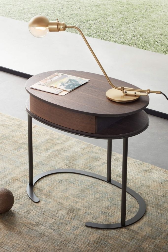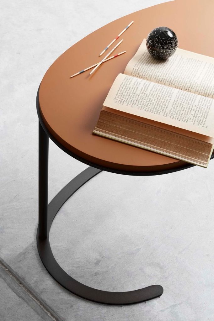The Ortis collection of side tables features an oval table top supported by a sleek structure of metal tubing anchored to a semi-circular base.VIC