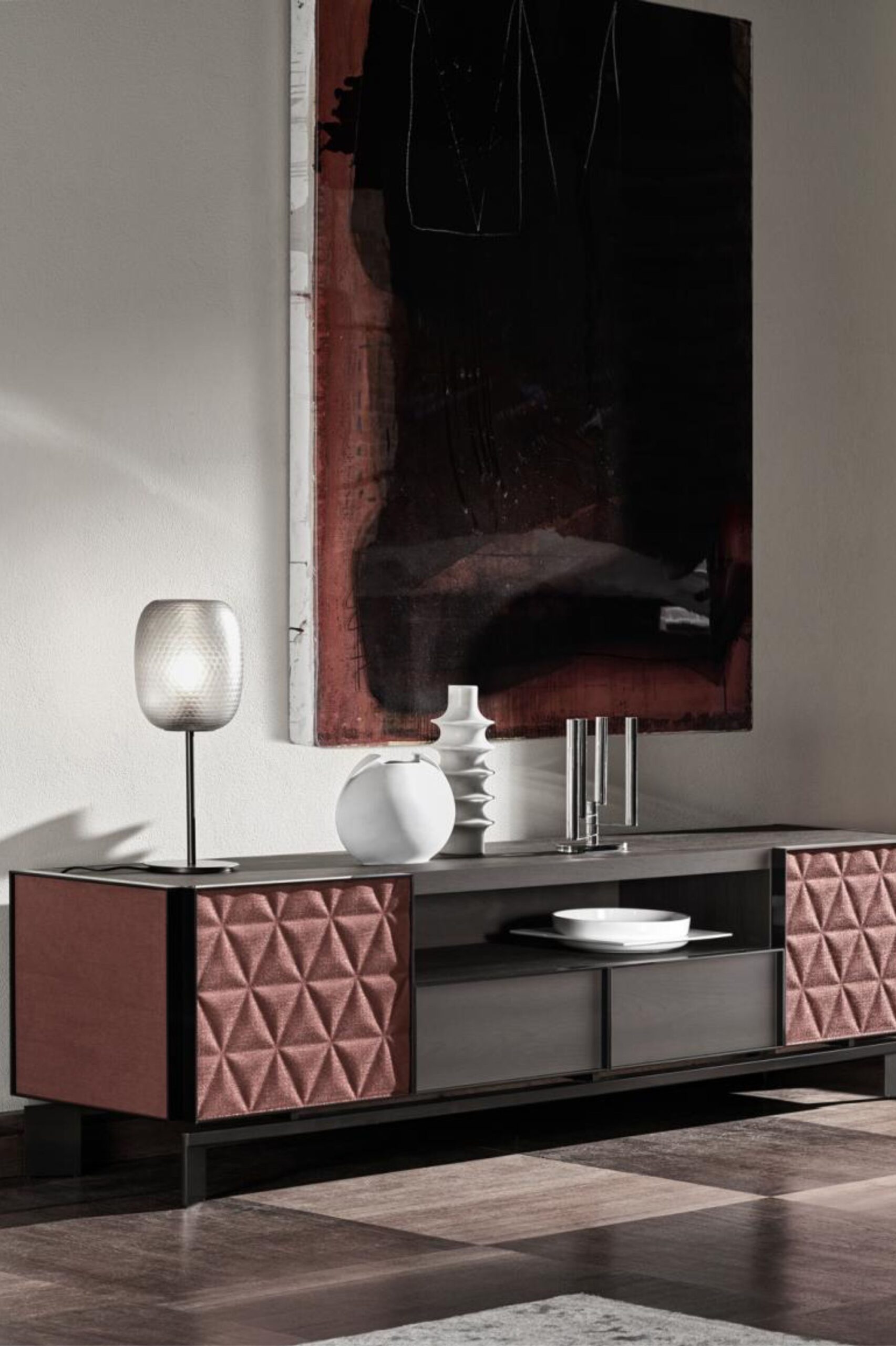 Charakterystycznym elementem kolekcji Sinua jest kontrast między linearnością blatów wykonanych z orzecha włoskiego, miękkimi krzywiznami skórzanych wykończeń.SILVANA LOUNGE