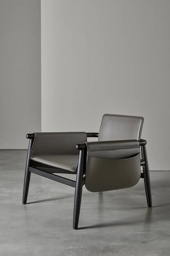 Teresa is an armchair characterized by excellent craftsmanship and the warmth of oak wood. Available in two versions defined as „soft” and „kuoio”. Soft defined by delicate leathers and fabrics, “kuoio” by a saddle leather. Both variants available with an accessory leather bag ready to hang on the backrest.