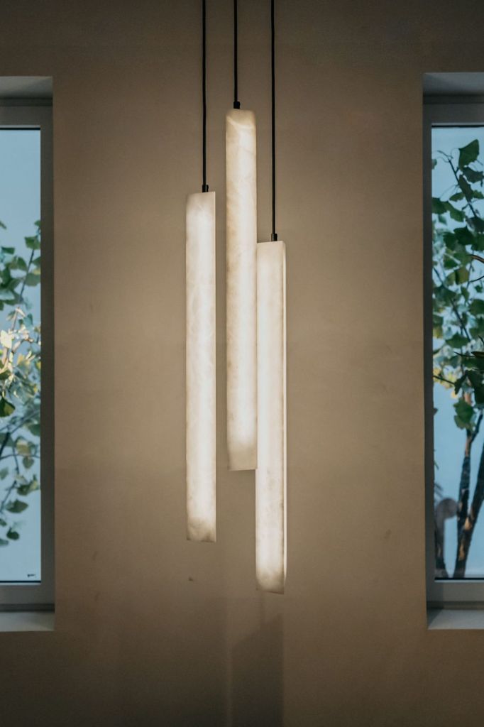 The lamp is composed of two overlapping alabaster stone discs, which generate a translucent effect and play with light to create a stunning visual experience.świat bronson: