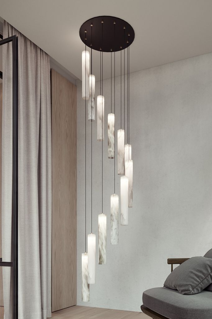 Set of alabaster cylinders suspended at different heights. Design of a very visual suspension lamp that fits perfectly in hotel halls or in the central spaces of stairs of any decorative style. The fixing elements of the screen have been designed and manufactured in threaded solid brass. This lamp designed in alabaster by United Alabaster is also supplied in individual format and with different bases of 6 or 12 shades.