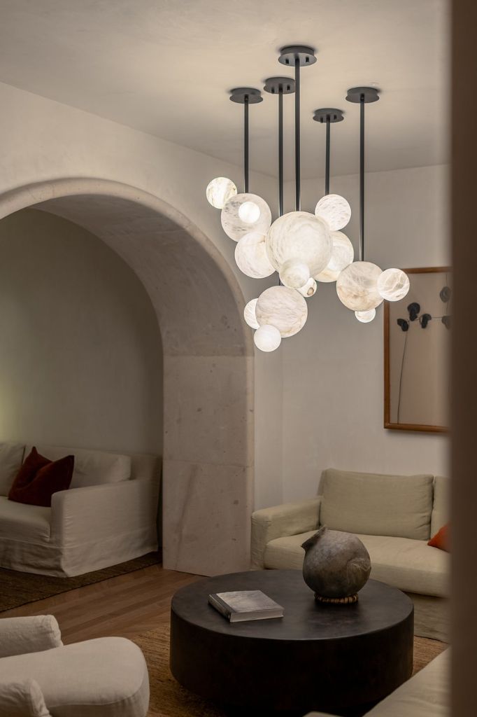 Lampa Up & Down to dzieło sztuki wykonane z naturalnego kamienia. Inspirowana związkiem między ziemią, a niebem. Lampa ta jest artystyczną interpretacją kamienia naturalnego, który wyłania się z ziemi i wznosi ku niebu. Składa się z trzech kul wykonanych z naturalnego, starannie wyselekcjonowanego kamienia alabastrowego. Lampa Up & Down ma pionową metalową konstrukcję, która utrzymuje trzy kule światła uwalniające strumień światła w górę i w dół, oświetlając otoczenie i podkreślając piękno naturalnego kamienia. Połączenie naturalnego kamienia i metalu tworzy elegancki kontrast w każdym pomieszczeniu. Wysokiej jakości naturalny kamień jest uzupełniony czarnym metalem, tworząc lampę, która jest zarówno oszałamiająca, jak i wyrafinowana.