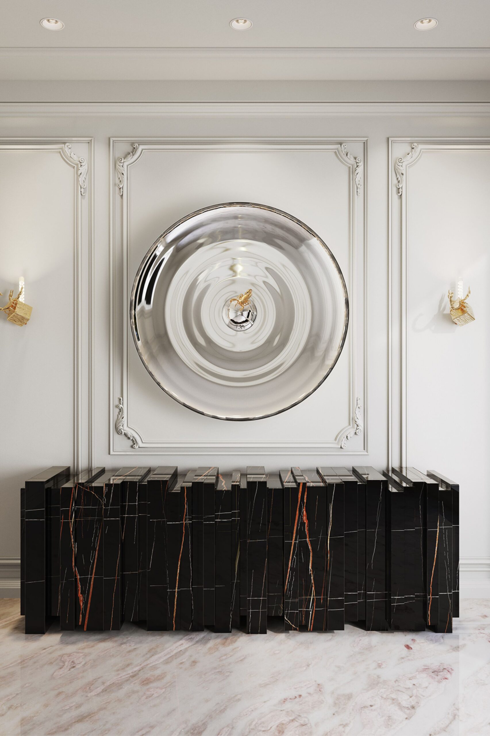 Vertigo sideboard is the perfect union of art and functionality. Divided into two parts, the luxurious design is accentuated by slabs of Sahara Noir marble, which add a touch of sophistication and exclusivity.
