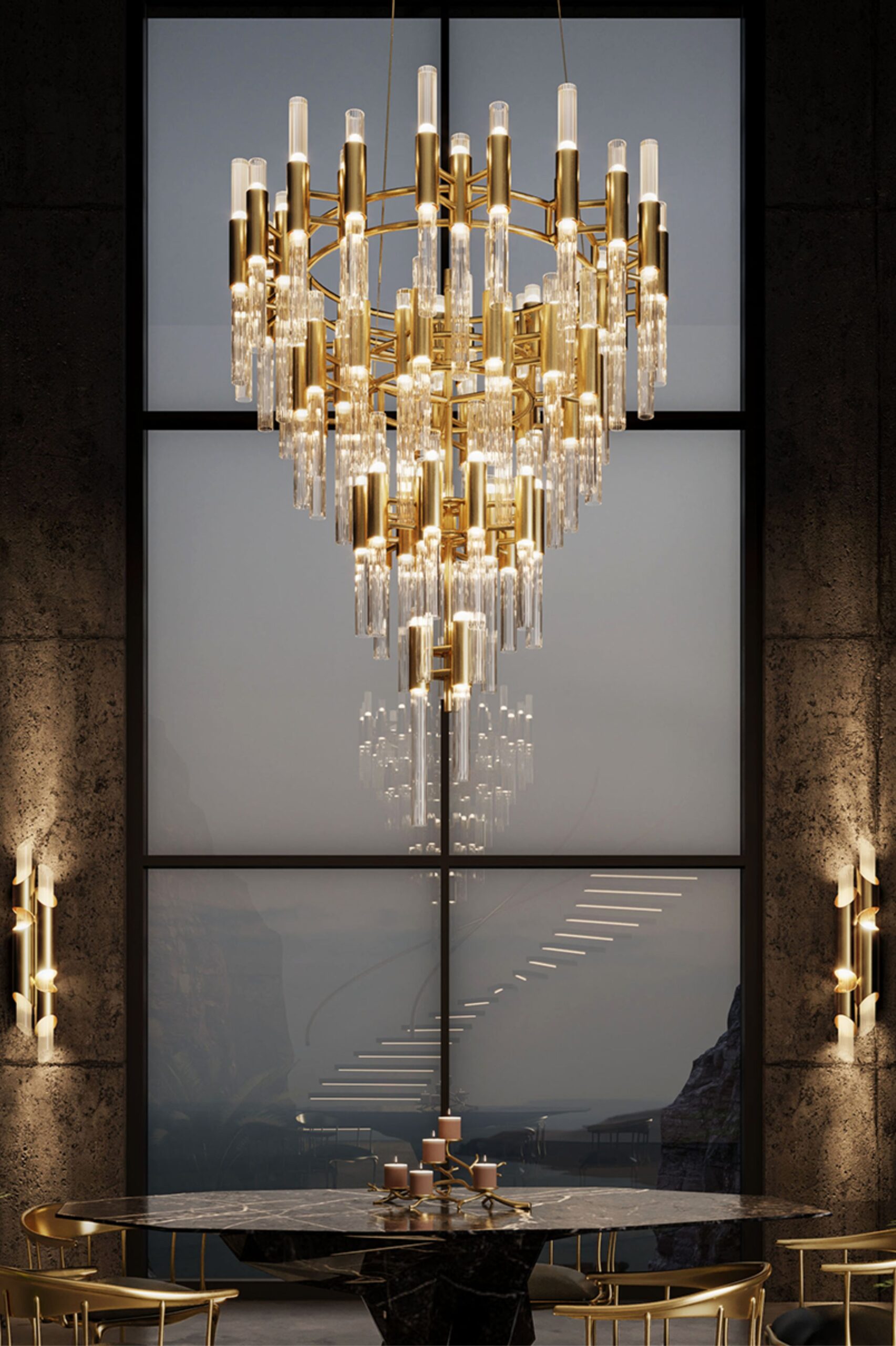 The Waterfall Chandelier is made with the best handmade techniques and high-quality materials, such as gold-plated brass and crystal glass.
